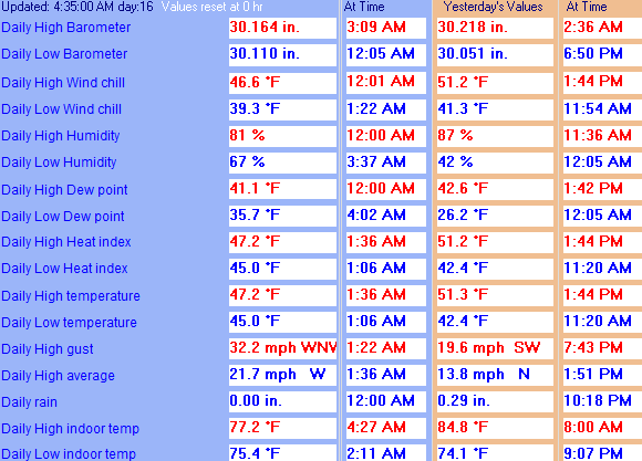 | Maximum Gust (since midnight) | 19.6 mph at: 7:43 PM | Maximum 1 minute average (since midnight) | 13.8 mph at: 1:51 PM |